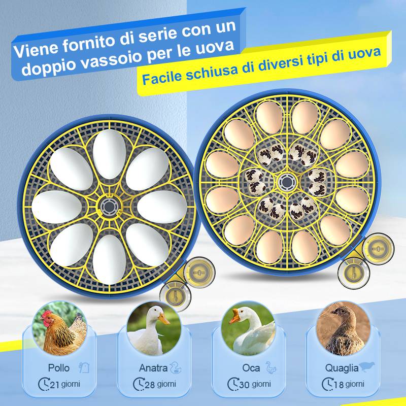 Questi incubatori sono progettati specificamente per vari tipi di uova di uccelli, come uova di gallina, uova di quaglia e uova di anatra, in grado di controllare con precisione temperatura e umidità, garantendo un alto tasso di incubazione.