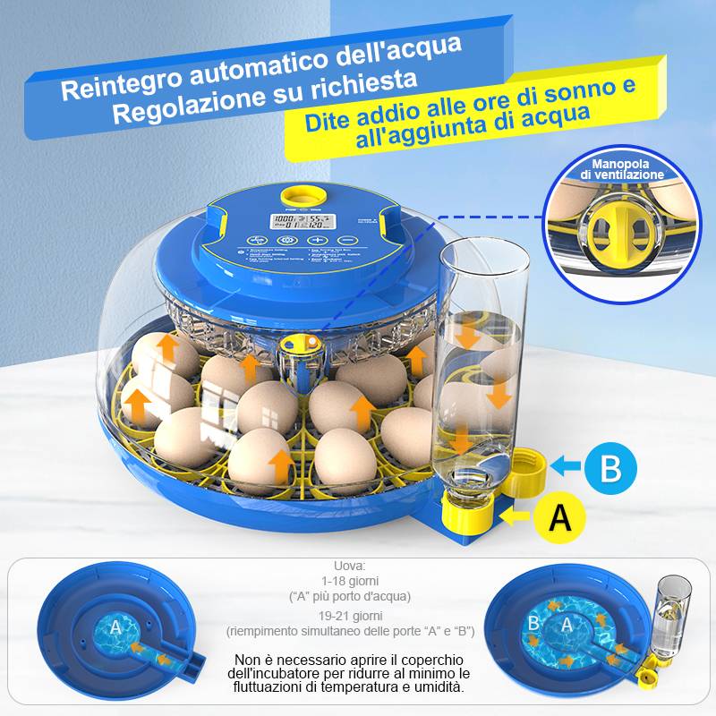 L'incubatrice per uova d'anatra è dotata di due bottiglie d'acqua da 300 millilitri e di un adattatore anti-perdita, facile ed efficiente da usare, che consente di aggiungere acqua esternamente senza aprire il coperchio. Il serbatoio A da 300 millilitri può soddisfare l'umidità necessaria per l'incubazione dei pulcini da 1 a 7 giorni. Durante il periodo di incubazione, dal 19° al 21° giorno, è necessario riempire completamente le bottiglie A e B per aumentare l'umidità e migliorare il tasso di successo dell'incubazione.