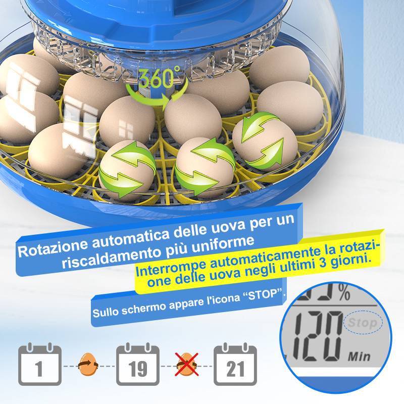 Un grande schermo LCD integrato, user-friendly e chiaro, offre una modalità con un solo pulsante per dati chiave come la rotazione delle uova, i giorni di incubazione, la temperatura e l'umidità. È possibile scegliere di visualizzare in gradi Fahrenheit o Celsius, aumentando la comodità. Se la temperatura supera il limite, un allarme acustico integrato vi avviserà quando la temperatura si discosta, facilitando un rapido aggiustamento. Basta premere il pulsante " - " per silenziare l'allerta.
