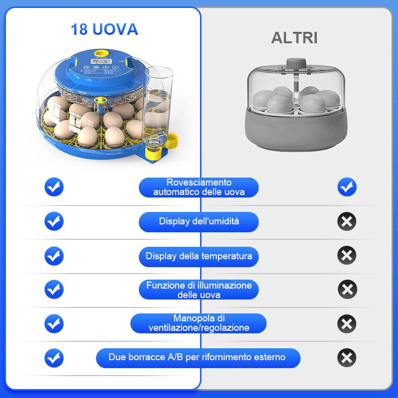 AsFrost 10 in 1 incubatore multifunzionale per uova soddisfa perfettamente varie esigenze, massimizzando al contempo il tasso di successo della schiusa. Che si tratti di scuola, casa o fattoria, qui troverai il lettino per la schiusa perfetto per le tue diverse esigenze di incubazione. Lascia che il nostro incubatore intelligente per uova di quaglia coltivi con precisione la nascita di una nuova vita!Incubatori 360 per l'allevamento: